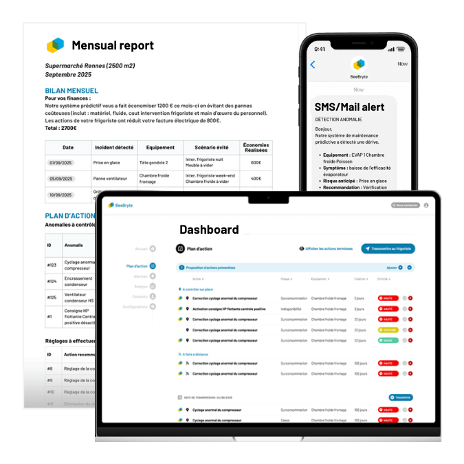 BeeBryte continuously monitors the data of your refrigeration, heating, ventilation and air conditioning equipment to detect typical drifts (icing, condenser clogging, compressor wear, blocked valves, etc.) and tell you where, when and how to intervene.